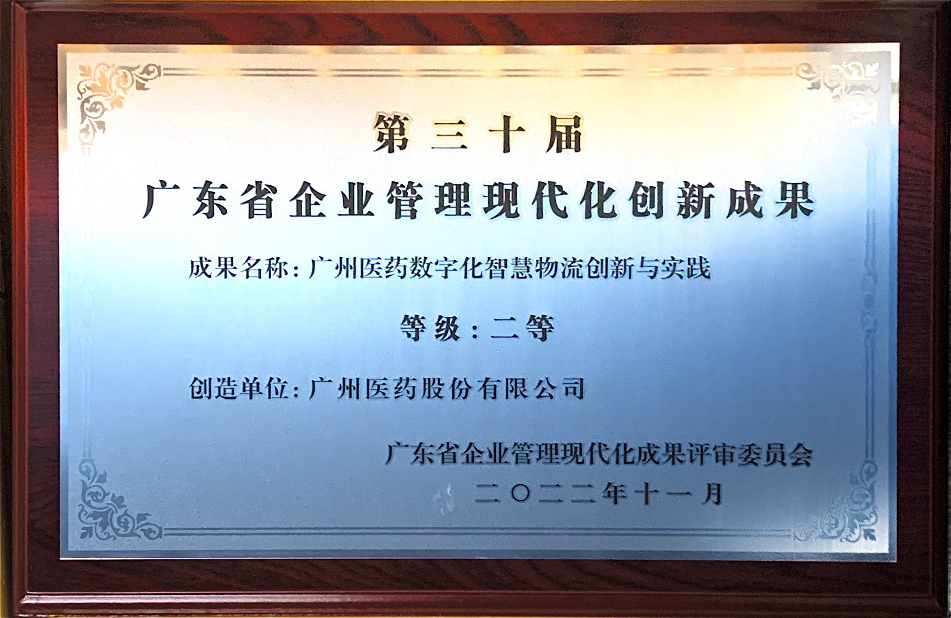 近日,由广东省工业和信息化厅、广东省人力资源和社会保障厅、广东省总工会和广东省企业联合会等单位共同组织,广东省企业管理现代化成果评审委员会承办的第三十届广东省企业管理现代化创新成果评审结果正式公布,《广州医药数字化智慧物流创新与实践》管理成果荣获二等奖。